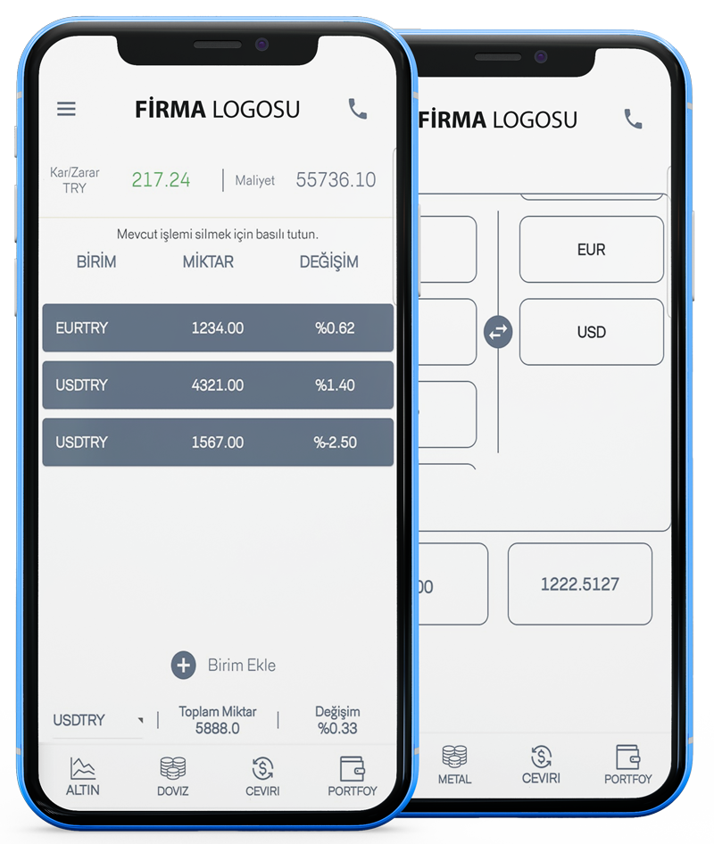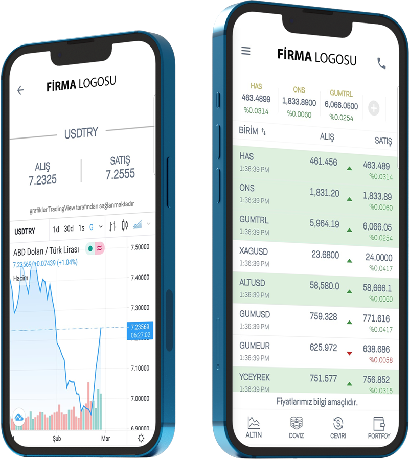 Müşterilerinize; Cep Telefonu ve/veya Tablet üzerinden ALTIN, DÖVİZ, PARİTE, GRAMALTIN, ZİYNET, SARRAFİYE, KRİPTO ve benzeri fiyatlarınızı anlık olarak paylaşabileceğiniz, müşterilerinize Portföy takibi imkanı sunan, Çevirici ekranı ile pariteleri dönüştürebileceği ve anlık grafiklerle takip edebileceği firmanıza özel bir mobil uygulaması yaptırmak artık çok kolay.